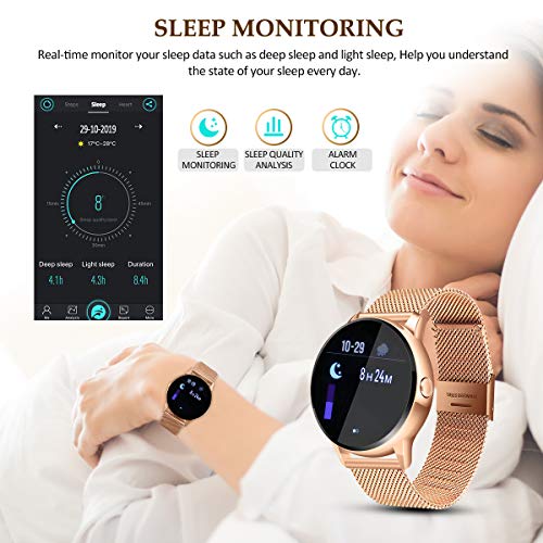 【Elegantes Metallarmband】: Der Look dieser Sportuhr ist gepaart mit Gold(Rötlich unter bestimmten Lichtverhältnissen) und Schwarz und sieht sehr modern und elegant aus. Es ist nicht nur für Männer geeignet, sondern auch sehr gut für Frauen. Dieses elegante Armband ist IP68 wasserdicht und das Mesh-Design bietet eine bessere Atmungsaktivität. Ideal für formelle Anlässe und alltägliche Anlässe. (Kein heißes Wasser verwenden)