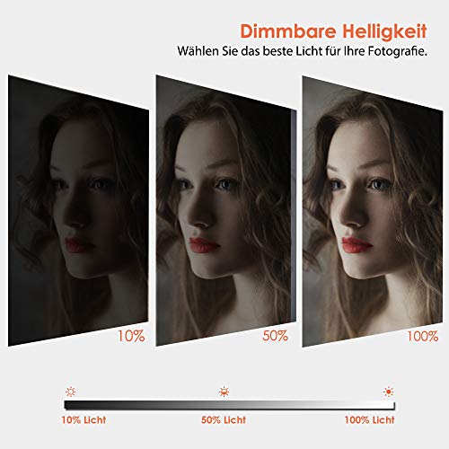 Farbtemperatur- und Helligkeitseinstellung: Mit zwei Drehreglern auf der rechten Seite des Bedienfelds, können Sie leicht Helligkeit von 10% bis 100% einstellen, um das am besten geeignete Licht für Ihre Lieblingsaktivitäten auszuwählen, und die Farbtemperatur nahtlos von 3300K bis 5600K einstellen, um sie zu ändern Aufnahmeeffekt für die Erfüllung Ihrer vielfältigen Bedürfnisse, keine Notwendigkeit mehr, zusätzliche Filter zu wechseln!