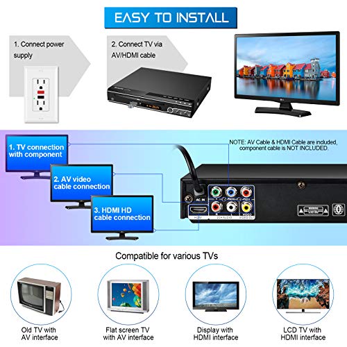 【Geeignet für jedes Fernsehgerät】Schließen Sie den DVD-Player über HDMI-, AV- oder Component-Kabel an Ihr Fernsehgerät an, z. B. Altes Fernsehgerät und Flachbildfernseher mit AV-Schnittstelle. Display & LCD-Fernseher mit HDMI-Schnittstelle. USB-Anschluss für die Wiedergabe Ihrer Filme, Musik und Fotos vom USB-Stick