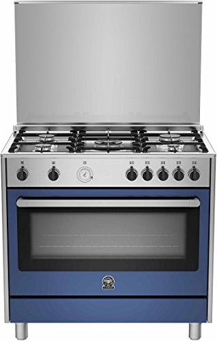 Gasherd mit Elektro-Backofen, 90 cm breit Herdkorpus Edelstahl, blau lackierte Front Ausstattung des Kochfeldes Edelstahloberfläche Gußtopfträger Glasabdeckung Knebel aus samtigem Kunststoff in schwarz