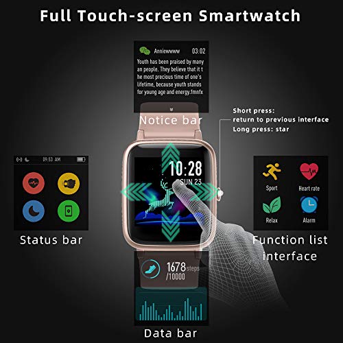 [Aktivitäts-Tracking & 9 Sportmodi] Der ganztägige Aktivitäts-Tracker der Smartwatch zeichnet Ihre Trainingsdaten und ganztägige Aktivitäten in Echtzeit auf, wie Schritte, Tempo, Kalorien, mit APP synchronisieren, werden die Daten für den Tag und die letzte Woche angezeigt. Die Sportuhr bietet 9 Sportmodi, wie Gehen, Laufen, Radfahren, Bergsteige, Laufband, Fitness usw.