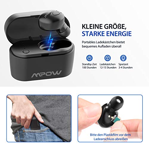 【15 Stunden Spielzeit & Tragbar Ladebox】Mpow Bluetooth Headset Mini bietet 4 Stunden Musikzeit und 100 Stunden Standby-Zeit. Tragbare Mini Ladebox kann die 4 ~ 5 mal vollständig für den Bluetooth Kopfhörer unterstützen. Mit leichtes Mini Ladebox können Sie das Kabellose Kopfhörer überall hin mitnehmen der ganzen Tag, ohne Sorge um Stromsfall. Ununterbrochenes Musikgenuss der ganzen Tag.