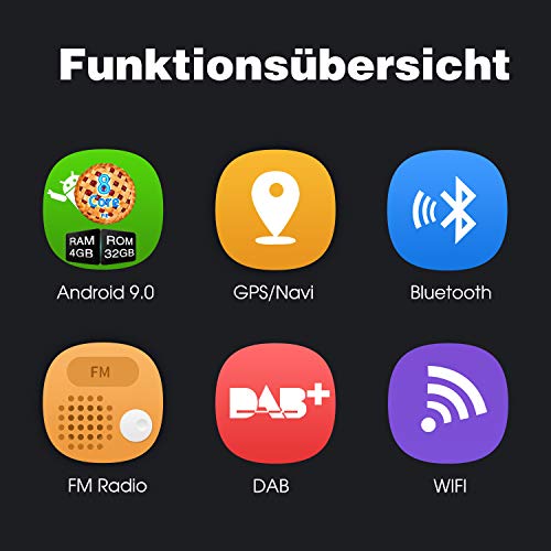 🚗 Das neueste Betriebssystem: Android 9.0 Pie, Arbeitsspeicher (RAM): 4GB, Interner Speicher (ROM): 32GB, Hauptprozessor(CPU): Octa Core Prozessor, mehr Speicher für Apps-Installtion, Bildschirmauflösung: 1024×600, Ausgangsleistung: max. 4x50W, Eingebauter Marken-Radio-IC: NXP TEF6686 für besseren Radioempfang