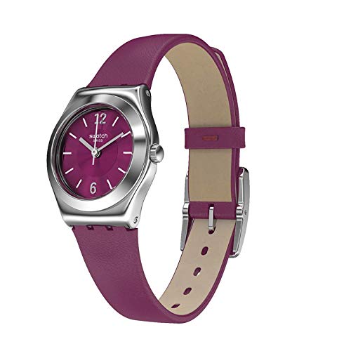 Mit einem violetten Zifferblatt mit Sonnenschliff und silbernen swatch-applikationen für gute Stimmung