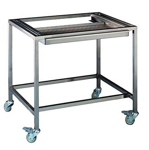 Massives Edelstahl-Vierkantrohr, zerlegbar ausziehbares Tranchierbroard in Winkelschiene. Für Rotisserien RT403 – RT406G – RT506Fahrbar mit 2 Lenk- und 2 Festrollen.