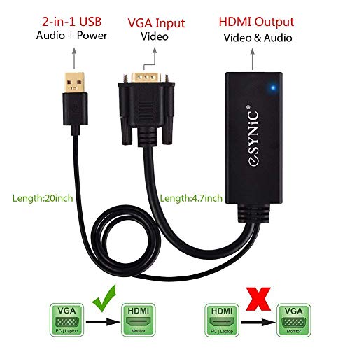 ESYNiC VGA zu HDMI Konverter gut für alle Geräte mit VGA Ausgang wie z.B. Stream-Bild, Video, Film, Spiel von PC für Display auf HDTV, HD-Projektor, DVD-/Blueray-Player, Set-Top-Boxen, Xbox und andere Abspielgeräte, perfekte für Heimkino, Konferenz, Präsentationen im Büro. Plug and Play, kommt das Gerät betriebsbereit zu bedienen, braucht keine Treibersoftware, voll kompatibel mit Windows, Linux OS