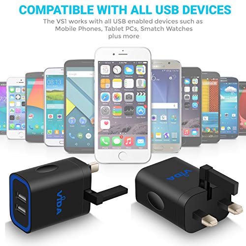 KOMPAKTES DESIGN: Ein einzigartiges 3-Pin-UK-Stecker-Design mit einem dritten 3-Pin-Stecker, der zusammenklappbar ist und kompakte Aufbewahrung ermöglicht. Durch das faltbare Design einfach in der Tasche zu verstauen. Das VS1 ist der beste Handyadapter für Ihr Gerät. Zwei USB-Anschlüsse zum gleichzeitigen Laden von zwei Mobiltelefonen oder Tablet-PCs.