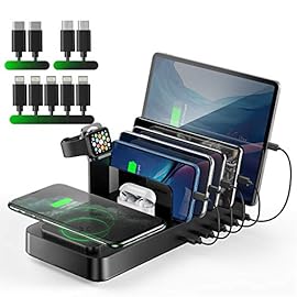 VOGEK Drahtlose Ladestation für mehrere Geräte, 5 USB-Anschlüsse 8-in-1-Ladestation mit maximal 10 W kabelloses Ladegerät für Apple iWatch/AirPods/iPhone/iPad/Samsung/Android/Tablets